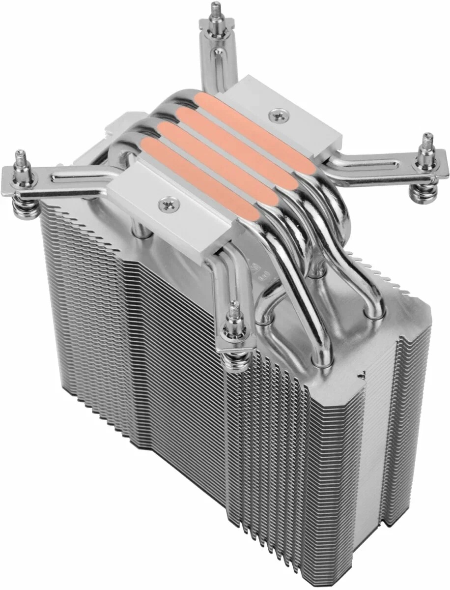 Сердцем системы охлаждения является массивный алюминиевый радиатор, пронизанный четырьмя тепловыми трубками диаметром 6 мм. Эти трубки, изготовленные по передовой технологии, обеспечивают мгновенный отвод тепла от процессора. Они находятся в прямом контакте с крышкой процессора через идеально отполированное медное основание