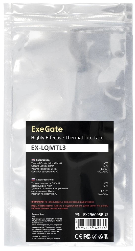 Жидкий металл ExeGate EX-LQMTL3 – это инновационное решение для эффективного охлаждения процессоров и других высоконагруженных компонентов компьютерных систем. Благодаря уникальному составу и передовым технологиям производства он обеспечивает исключительную теплопроводность, превосходящую традиционные термопасты в несколько раз. Если вы ищете максимально эффективный способ отвода тепла от вашего процессора или видеокарты, этот продукт станет идеальным выбором.