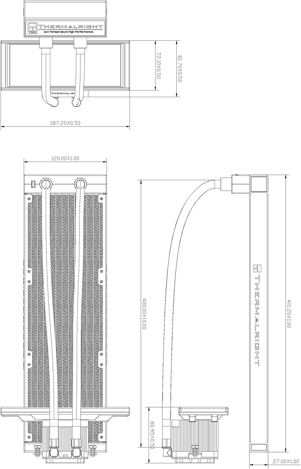 Размеры радиатора: L403 мм x W120 мм x H27 мм
