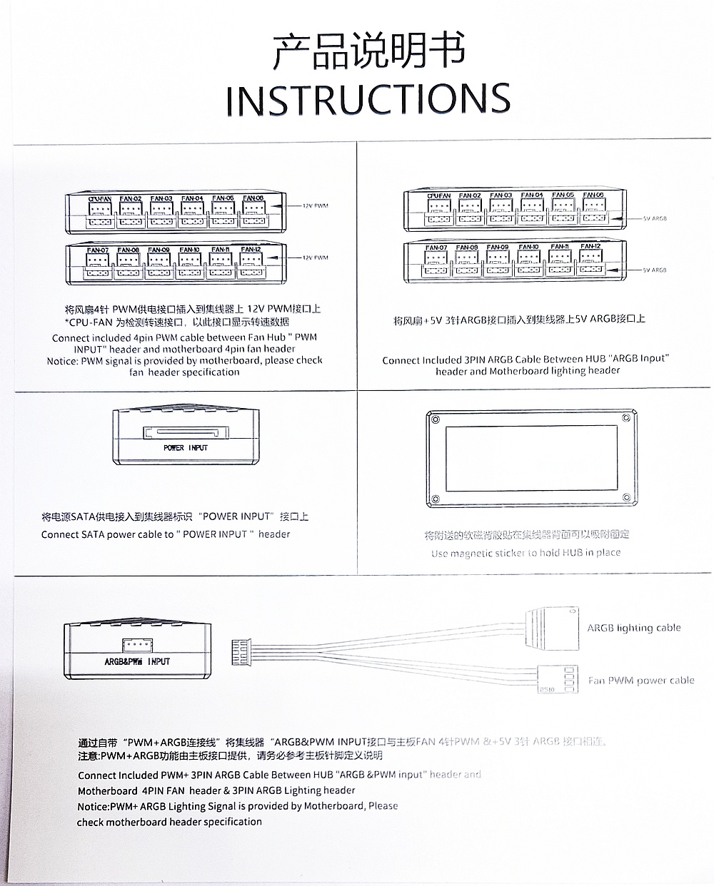 Подключайте до 12-и (PWM) ШИМ-вентиляторов (4-pin) и до 12-и ARGB-устройств (3-pin 5V), кабель управления к материнской плате, и один разъем для получения питания SATA . Материнская плата получает сигнал скорости с одного вентилятора (красный порт CPU_FAN, обязательно задействуйте его) и транслирует сигнал управления на все подключенные PWM вентиляторы. Управляя всеми вентиляторами как одним.
