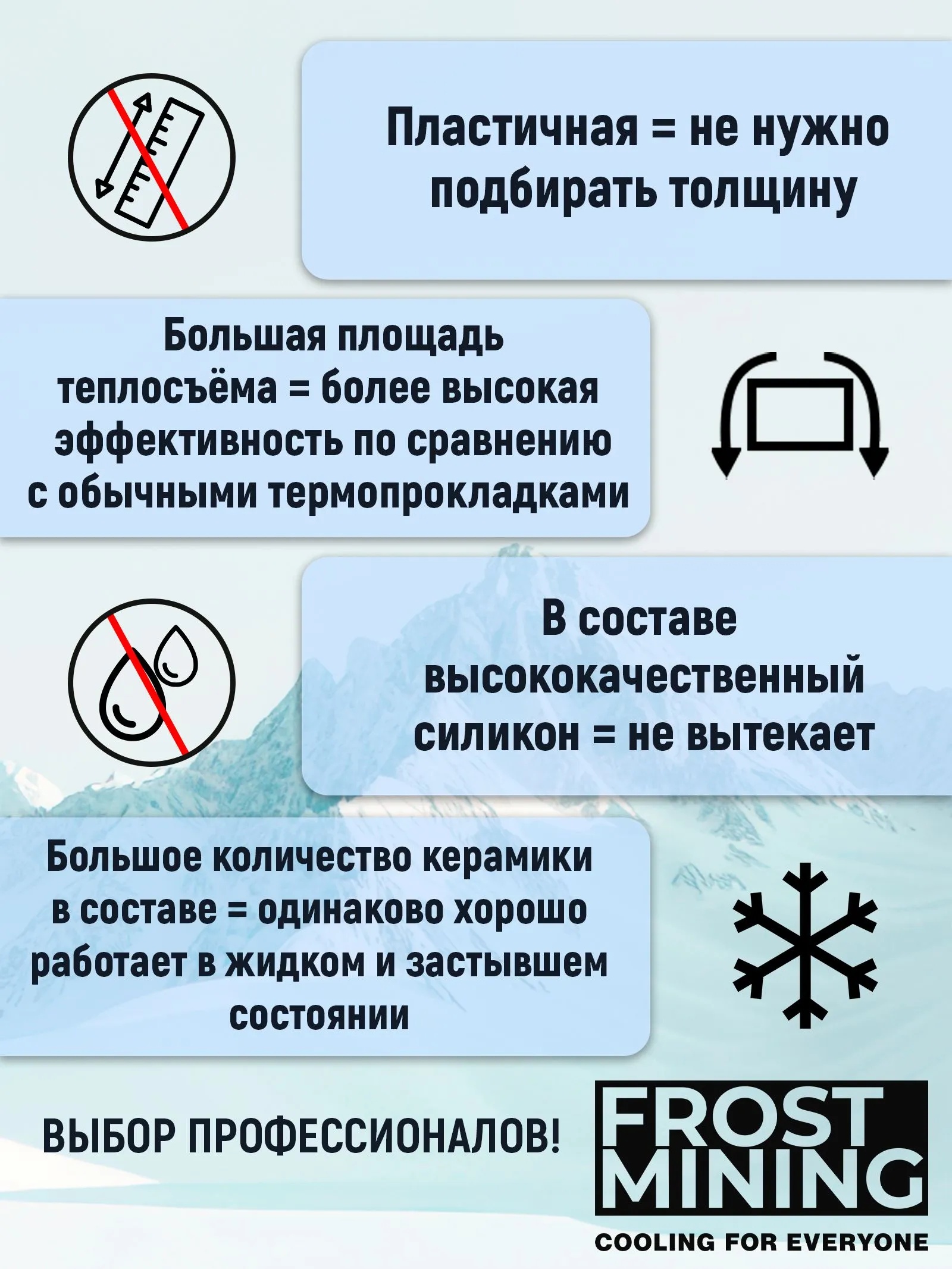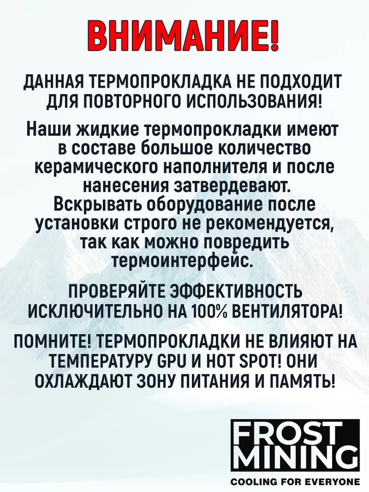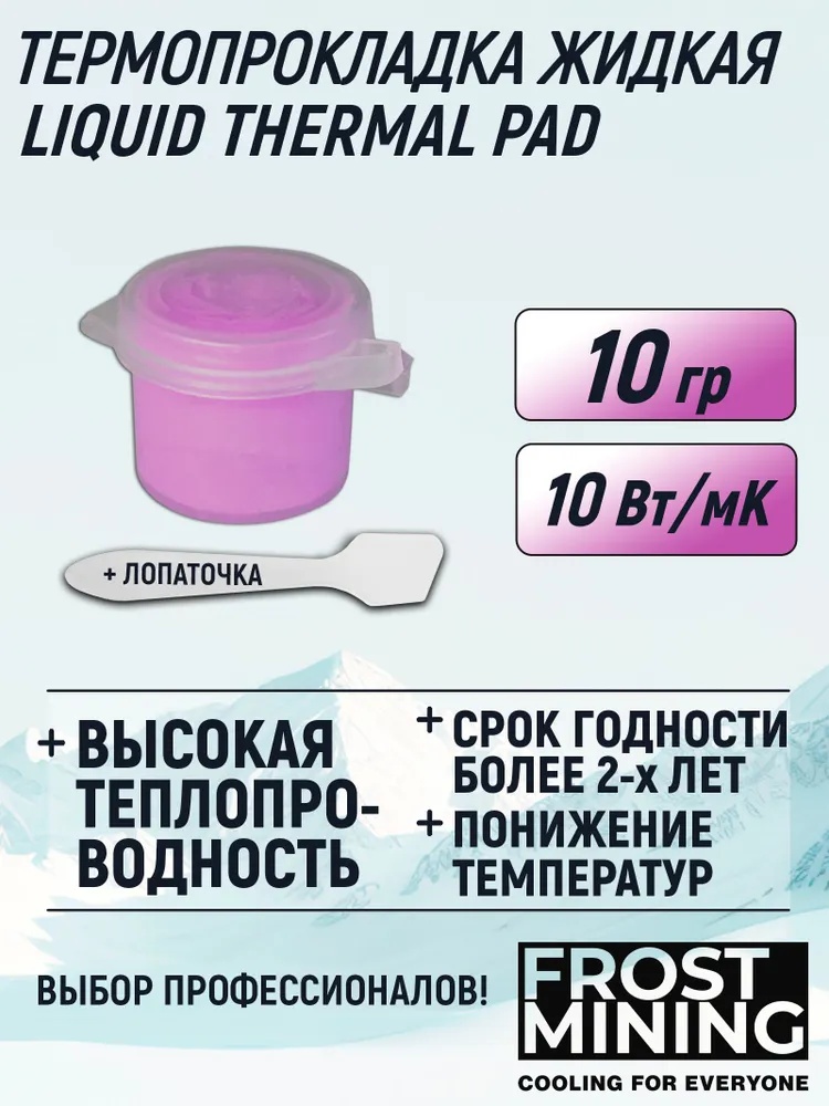 Жидкая термопрокладка для ноутбука, видеокарты, консоли, компьютера, асика, телефона и иной техники, где конструктивно возможно использование жидких термопрокладок. Примечание: нельзя применять жидкую термопрокладку вместо термопасты! Жидкая термопрокладка FrostMining Liquid Thermal Pads 10 Вт/мК – один из самых доступных и качественных пластичных термоинтерфейсов (жидкие термопрокладки) на рынке РФ! Проверенный множеством тестов в играх, майнинге 24/7 термоинтерфейс содержит в своем составе качественные керамические наполнители и высококачественный силикон.
