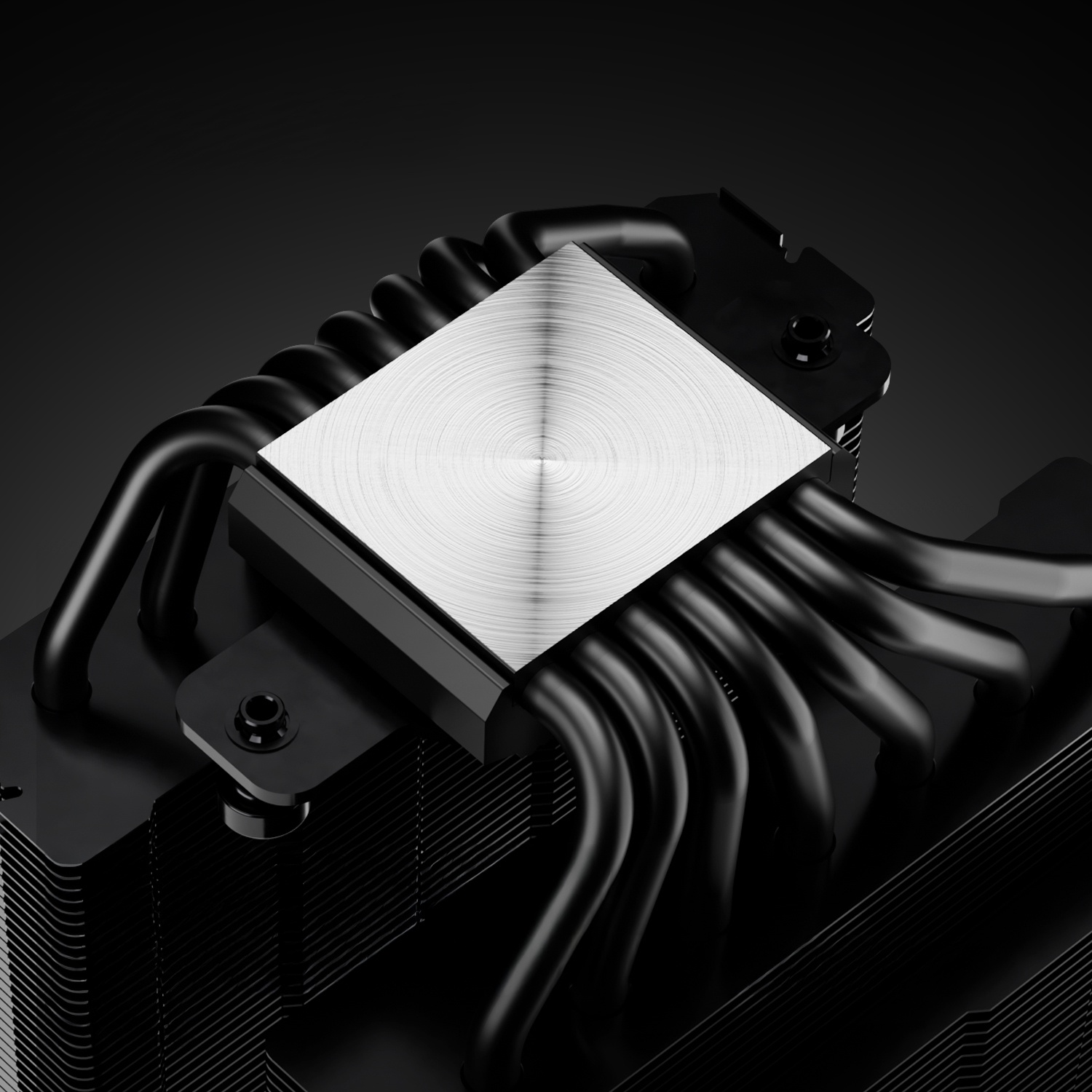 Магнитный дисплей на верхней панели отображает температуру и загрузку CPU/GPU в реальном времени. Два вентилятора TL-K12 создают воздушный поток 69 CFM при давлении 2,87 мм вод. ст., уровень шума не превышает 27 дБА. Семь никелированных тепловых трубок диаметром 6 мм с прямым контактом обеспечивают максимальный отвод тепла.
